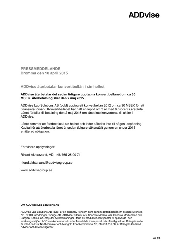 ADDvise Lab Solutions AB (publ) upptog ett konvetibellån 2012 om ca 30 MSEK för att finansiera förvärv. Konvertibellånet har haft en löptid om 3 år med 8 procents årsränta. Lånet förfaller till betalning den 2 maj 2015 om lånet inte konverteras till aktier i ADDvise.