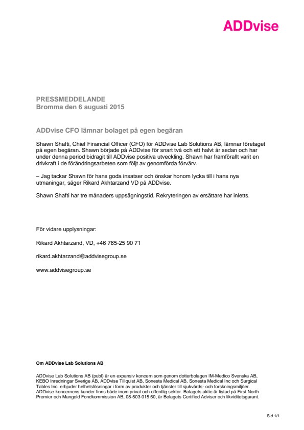 ADDvise Lab Solutions AB (publ) är en expansiv koncern som genom dotterbolagen IM-Medico Svenska AB, KEBO Inredningar Sverige AB, ADDvise Tillquist AB, Sonesta Medical AB, Sonesta Medical Inc och Surgical Tables Inc. erbjuder helhetslösningar i form av produkter och tjänster till sjukvårds- och forskningsmiljöer. ADDvise-koncernens kunder finns både inom privat och offentlig sektor. Bolagets aktie är listad på First North Premier och Mangold Fondkommission AB, 08-503 015 50, är Bolagets Certified Adviser och likviditetsgarant.