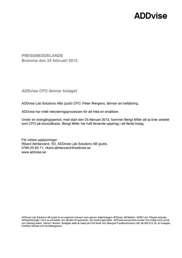 ADDvise Lab Solutions AB (publ) är en expansiv koncern som genom dotterbolagen ADDvise, IM Medico, KEBO och Tillquist erbjuder helhetslösningar i form av produkter och tjänster till sjukvårds- och forskningsmiljöer. ADDvise-koncernens kunder finns både inom privat och offentlig sektor, främst i Norden. Bolagets aktie är listad på First North och Mangold Fondkommission AB, 08-503 015 50, är bolagets Certified Adviser och likviditetsgarant.
