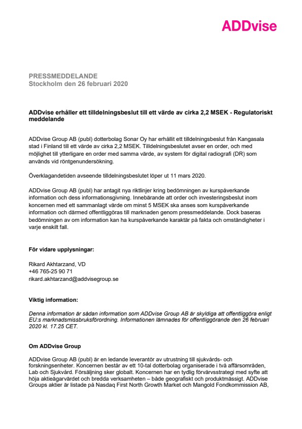 ADDvise Group AB (publ) dotterbolag Sonar Oy har erhållit ett tilldelningsbeslut från Kangasala stad i Finland till ett värde av cirka 2,2 MSEK. Tilldelningsbeslutet avser en order, och med möjlighet till ytterligare en order med samma värde, av system för digital radiografi (DR) som används vid röntgenundersökning.