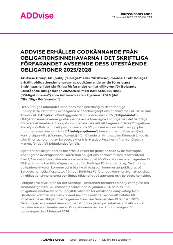 ADDvise Group AB (publ) (”Bolaget” eller ”ADDvise”) meddelar att Bolaget erhållit obligationsinnehavarnas godkännande av de föreslagna ändringarna i det skriftliga förfarandet enligt villkoren för Bolagets utestående obligationer 2025/2028 med ISIN SE0025011885 (”Obligationerna”) som initierades den 2 januari 2026 (det ”Skriftliga Förfarandet”).