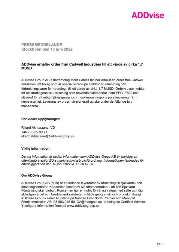 ADDvise Group AB:s dotterbolag Merit Cables Inc har erhållit en order från Cadwell Industries, ett bolag som är specialiserade på elektroder, utrustning och förbrukningsvaror för neurologi, till ett värde av cirka 1,7 MUSD. Ordern avser kablar för elektrodiagnostisk utrustning som används bland annat inom EEG, EMG och ultraljud för att mäta hjärnsignaler och musklernas respons på stimulering från nervsystemet. Leverans av ordern är planerad att ske under de följande tolv månaderna.