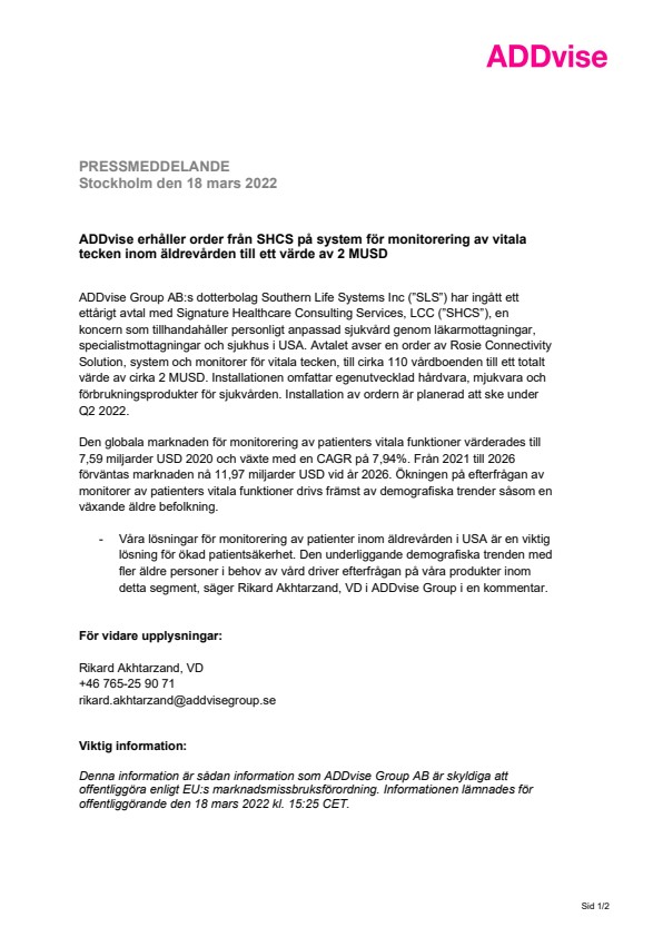 ADDvise Group AB:s dotterbolag Southern Life Systems Inc (”SLS”) har ingått ett ettårigt avtal med Signature Healthcare Consulting Services, LCC (”SHCS”), en koncern som tillhandahåller personligt anpassad sjukvård genom läkarmottagningar, specialistmottagningar och sjukhus i USA. Avtalet avser en order av Rosie Connectivity Solution, system och monitorer för vitala tecken, till cirka 110 vårdboenden till ett totalt värde av cirka 2 MUSD. Installationen omfattar egenutvecklad hårdvara, mjukvara och förbrukningsprodukter för sjukvården. Installation av ordern är planerad att ske under Q2 2022.
