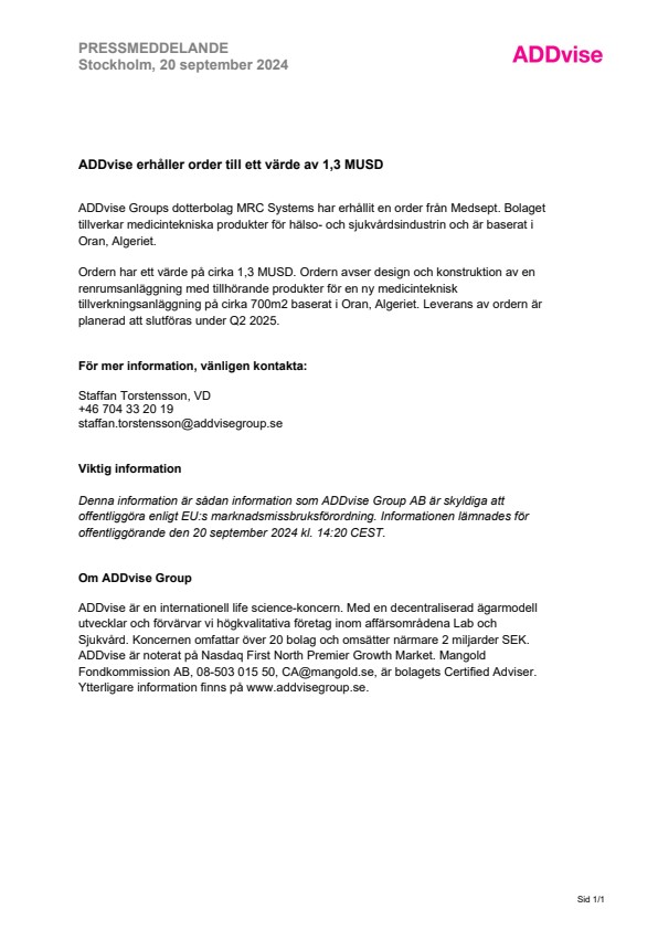 ADDvise Groups dotterbolag MRC Systems har erhållit en order från Medisept. Bolaget tillverkar medicintekniska produkter för hälso- och sjukvårdsindustrin och är baserat i Oran, Algeriet.