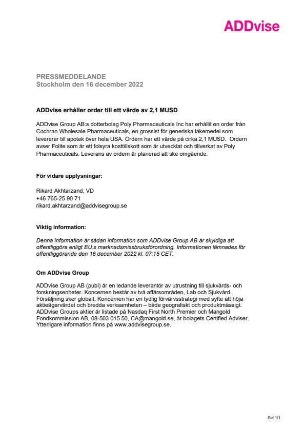 ADDvise Group AB:s dotterbolag Poly Pharmaceuticals Inc har erhållit en order från Cochran Wholesale Pharmaceuticals, en grossist för generiska läkemedel som levererar till apotek över hela USA. Ordern har ett värde på cirka 2,1 MUSD. Ordern avser Folite som är ett folsyra kosttillskott som är utvecklat och tillverkat av Poly Pharmaceuticals. Leverans av ordern är planerad att ske omgående.