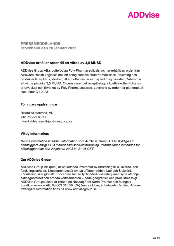 ADDvise Group AB:s dotterbolag Poly Pharmaceuticals Inc har erhållit en order från AxisCare Health Logistics Inc, ett bolag som distribuerar medicinsk utrustning och produkter till sjukhus, kliniker, läkarmottagningar och sjukvårdsgrossister. Ordern har ett värde på cirka 3,5 MUSD. Ordern avser det receptbelagda kosttillskottet Folite som är utvecklat och tillverkat av Poly Pharmaceuticals. Leverans av ordern är planerad att ske under Q1 2023.