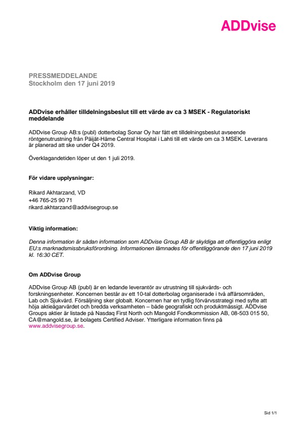 ADDvise Group AB:s (publ) dotterbolag Sonar Oy har fått ett tilldelningsbeslut avseende röntgenutrustning från Päijät-Häme Central Hospital i Lahti till ett värde om ca 3 MSEK. Leverans är planerad att ske under Q4 2019.