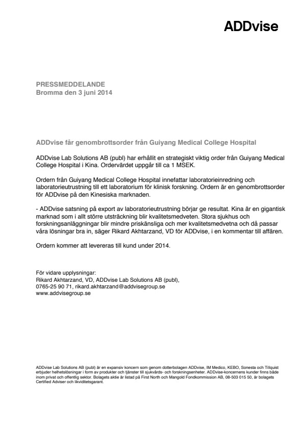 – ADDvise satsning på export av laboratorieutrustning börjar ge resultat. Kina är en gigantisk marknad som i allt större utsträckning blir kvalitetsmedveten. Stora sjukhus och forskningsanläggningar blir mindre priskänsliga och mer kvalitetsmedvetna och då passar våra lösningar bra in, säger Rikard Akhtarzand, VD för ADDvise, i en kommentar till affären.