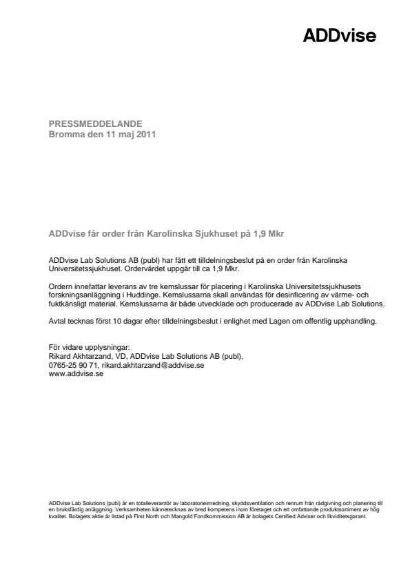 ADDvise får order från Karolinska Sjukhuset på 1,9 Mkr