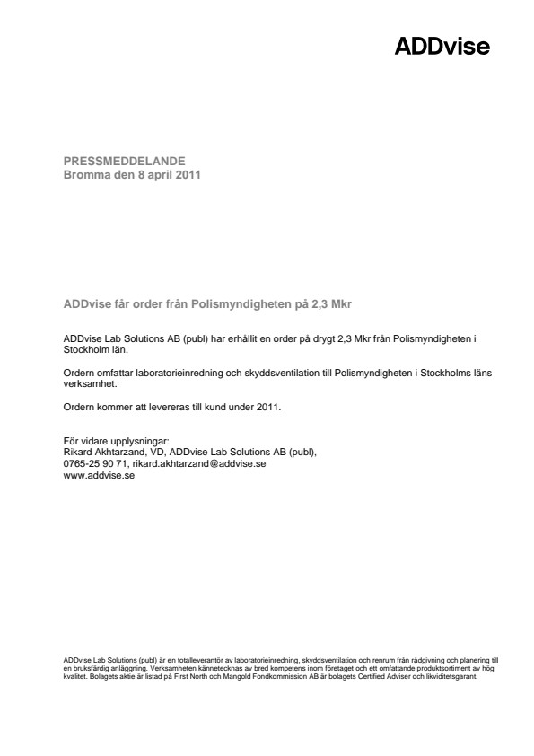 ADDvise får order från Polismyndigheten på 2,3 Mkr