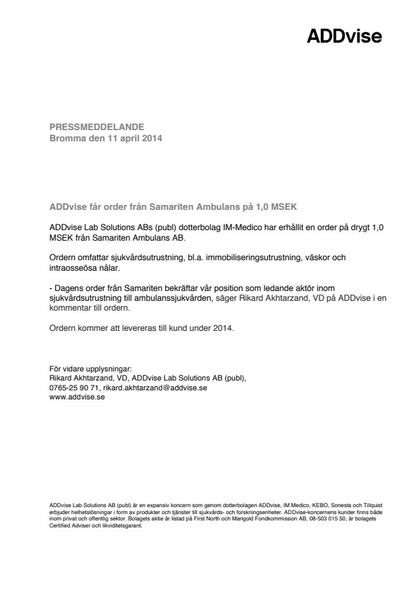 ADDvise Lab Solutions AB (publ) är en expansiv koncern som genom dotterbolagen ADDvise, IM Medico, KEBO, Sonesta och Tillquist erbjuder helhetslösningar i form av produkter och tjänster till sjukvårds- och forskningsenheter. ADDvise-koncernens kunder finns både inom privat och offentlig sektor. Bolagets aktie är listad på First North och Mangold Fondkommission AB, 08-503 015 50, är bolagets Certified Adviser och likviditetsgarant.