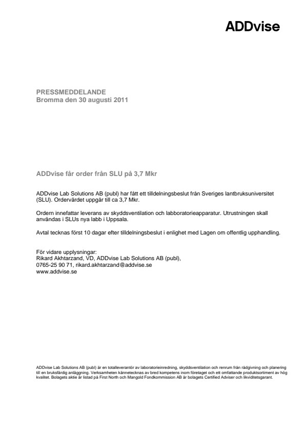 ADDvise Lab Solutions AB (publ) är en totalleverantör av laboratorieinredning, skyddsventilation och renrum från rådgivning och planering till en bruksfärdig anläggning. Verksamheten kännetecknas av bred kompetens inom företaget och ett omfattande produktsortiment av hög kvalitet. Bolagets aktie är listad på First North och Mangold Fondkommission AB är bolagets Certified Adviser och likviditetsgarant.