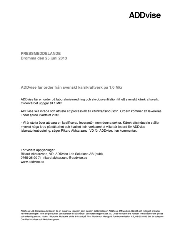 ADDvise Lab Solutions AB (publ) är en expansiv koncern som genom dotterbolagen ADDvise, IM Medico, KEBO och Tillquist erbjuder helhetslösningar i form av produkter och tjänster till sjukvårds- och forskningsmiljöer. ADDvise-koncernens kunder finns både inom privat och offentlig sektor, främst i Norden. Bolagets aktie är listad på First North och Mangold Fondkommission AB, 08-503 015 50, är bolagets Certified Adviser och likviditetsgarant.