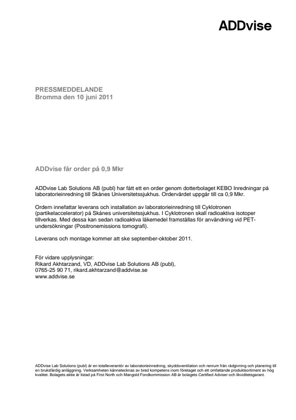 ADDvise Lab Solutions (publ) är en totalleverantör av laboratorieinredning, skyddsventilation och renrum från rådgivning och planering till en bruksfärdig anläggning. Verksamheten kännetecknas av bred kompetens inom företaget och ett omfattande produktsortiment av hög kvalitet. Bolagets aktie är listad på First North och Mangold Fondkommission AB är bolagets Certified Adviser och likviditetsgarant.