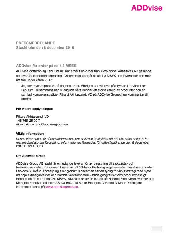 Rikard Akhtarzand, VD +46 765-25 90 71 rikard.akhtarzand@addvisegroup.se