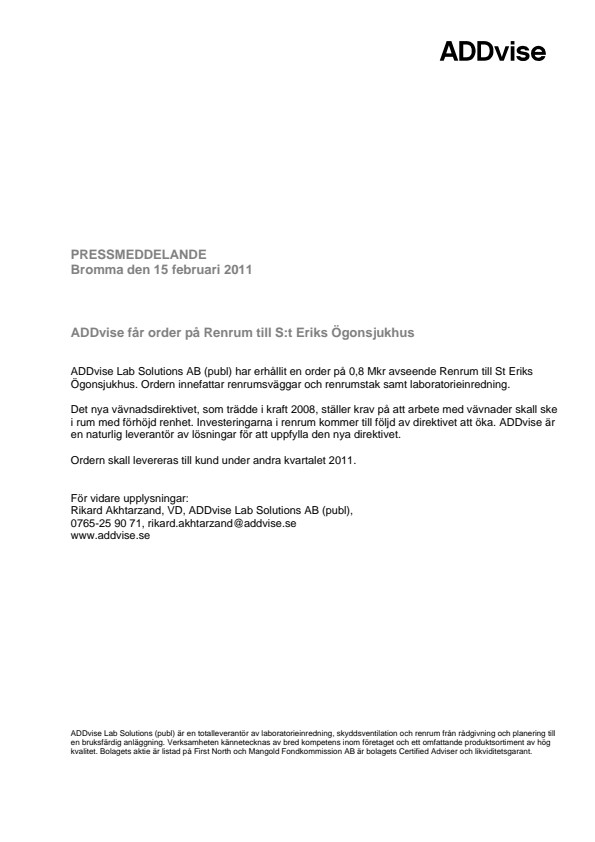 ADDvise Lab Solutions (publ) är en totalleverantör av laboratorieinredning, skyddsventilation och renrum från rådgivning och planering till en bruksfärdig anläggning. Verksamheten kännetecknas av bred kompetens inom företaget och ett omfattande produktsortiment av hög kvalitet. Bolagets aktie är listad på First North och Mangold Fondkommission AB är bolagets Certified Adviser och likviditetsgarant.
