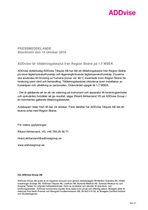 Avtalsspärr råder fram till den 24 oktober. Först därefter har ADDvise Tillquist AB rätt att teckna avtal med Region Skåne.