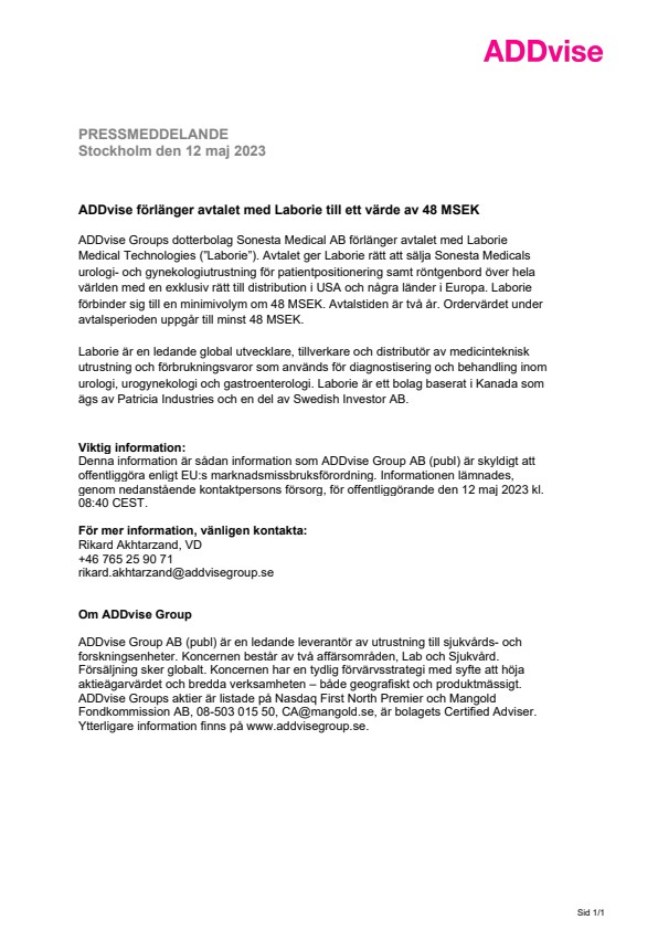 ADDvise Groups dotterbolag Sonesta Medical AB förlänger avtalet med Laborie Medical Technologies (”Laborie”). Avtalet ger Laborie rätt att sälja Sonesta Medicals urologi- och gynekologiutrustning för patientpositionering samt röntgenbord över hela världen med en exklusiv rätt till distribution i USA och några länder i Europa. Laborie förbinder sig till en minimivolym om 48 MSEK. Avtalstiden är två år. Ordervärdet under avtalsperioden uppgår till minst 48 MSEK.