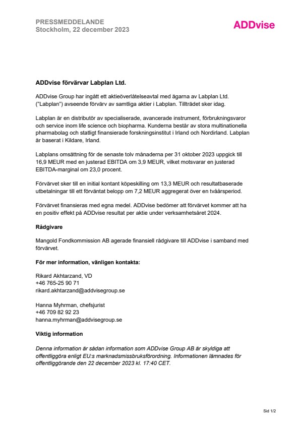 ADDvise Group har ingått ett aktieöverlåtelseavtal med ägarna av Labplan Ltd. (”Labplan”) avseende förvärv av samtliga aktier i Labplan. Tillträdet sker idag.