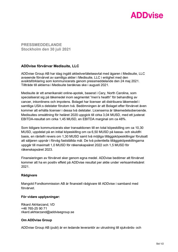 ADDvise Group AB har idag ingått aktieöverlåtelseavtal med ägaren i Medisuite, LLC avseende förvärvet av samtliga aktier i Medisuite, LLC i enlighet med den avsiktsförklaring som kommunicerats genom pressmeddelande den 24 maj 2021. Tillträde till aktierna i Medisuite beräknas ske i augusti 2021.