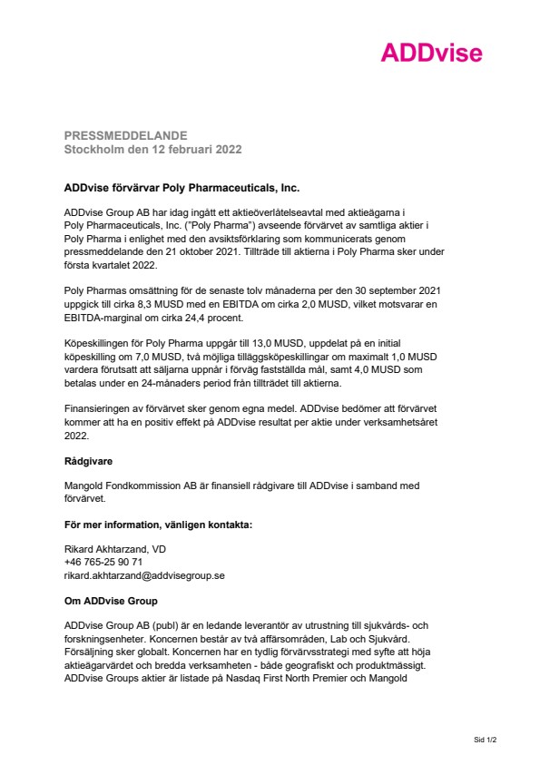 ADDvise förvärvar Poly Pharmaceuticals, Inc.