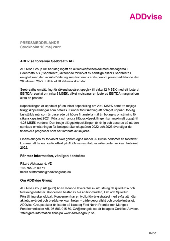 ADDvise Group AB har idag ingått ett aktieöverlåtelseavtal med aktieägarna i Seebreath AB (”Seebreath”) avseende förvärvet av samtliga aktier i Seebreath i enlighet med den avsiktsförklaring som kommunicerats genom pressmeddelande den 28 februari 2022. Tillträdet till aktierna sker idag.