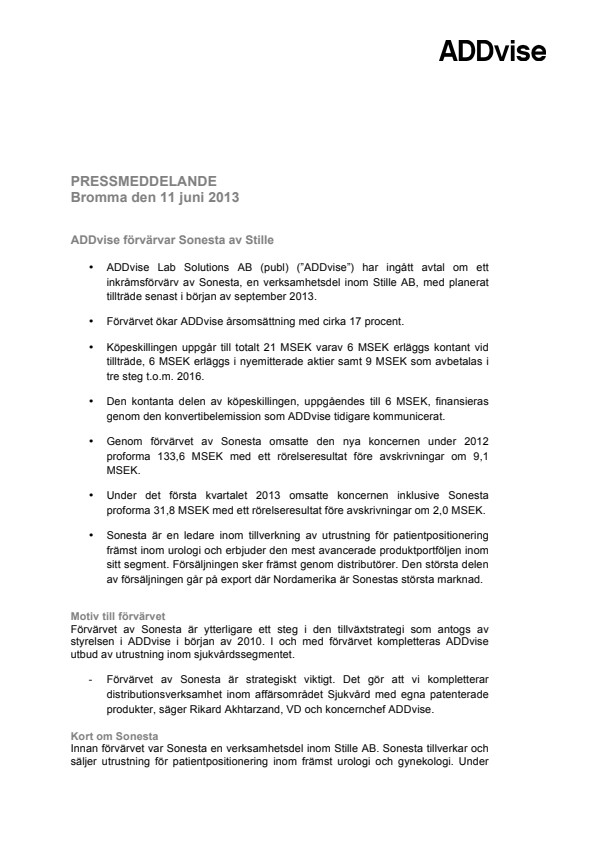 I det fall Sonesta konsoliderats proformamässigt den 1 januari 2012, samt de övriga förvärv som ADDvise genomförde under 2012, hade ADDvise omsättning uppgått till 133,6 MSEK och haft ett rörelseresultat före avskrivningar om 9,1 MSEK för räkenskapsåret 2012. Under samma förutsättning hade koncernen omsatt 31,8 MSEK med ett rörelseresultat före avskrivningar om 2,0 MSEK under det första kvartalet 2013.