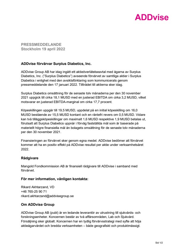 ADDvise Group AB har idag ingått ett aktieöverlåtelseavtal med ägarna av Surplus Diabetics, Inc. (”Surplus Diabetics”) avseende förvärvet av samtliga aktier i Surplus Diabetics i enlighet med den avsiktsförklaring som kommunicerats genom pressmeddelande den 17 januari 2022. Tillträdet till aktierna sker idag.