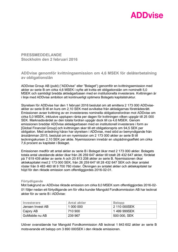 Styrelsen för ADDvise har den 1 februari 2016 beslutat om att emittera 2 173 000 ADDvise-aktier av serie B till en kurs om 2,10 SEK med avvikelse från aktieägarnas företrädesrätt. Emissionen avser kvittning av en investerares nominella obligationsfordran mot ADDvise om cirka 5,0 MSEK, inklusive upplupen ränta per dagen för kvittningen vilken uppgår till 25 000 SEK. Marknadsvärdet av den totala fordran uppgår dock till ca 4,6 MSEK. Genom emissionen breddar ADDvise aktieägarbasen med en institutionell investerare i form av [Global Financial Group] och kvittningen sker till ett obligationspris om 94,5 SEK per obligation. Med anledning härav har styrelsen i ADDvise, med stöd av bemyndigande från årsstämman 2015, beslutat om en nyemission om 2 173 000 aktier av serie B till teckningskursen 2,10 SEK per aktie. Nyemissionen innebär en utspädningseffekt om cirka 7,6 procent av kapitalet i Bolaget.