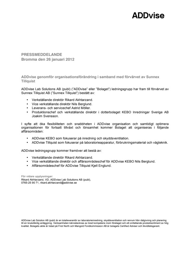 ADDvise genomför organisationsförändring i samband med förvärvet av Sunnex Tillquist