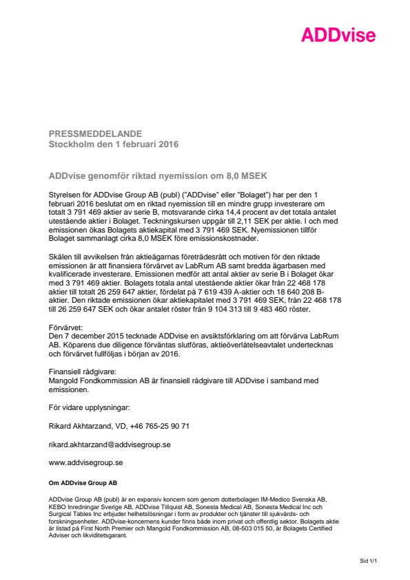 Förvärvet: Den 7 december 2015 tecknade ADDvise en avsiktsförklaring om att förvärva LabRum AB. Köparens due diligence förväntas slutföras, aktieöverlåtelseavtalet undertecknas och förvärvet fullföljas i början av 2016.