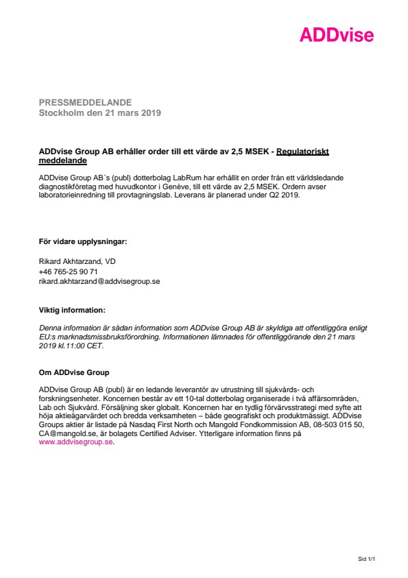 ADDvise Group AB´s (publ) dotterbolag LabRum har erhållit en order från ett världsledande diagnostikföretag med huvudkontor i Genève, till ett värde av 2,5 MSEK. Ordern avser laboratorieinredning till provtagningslab. Leverans är planerad under Q2 2019.