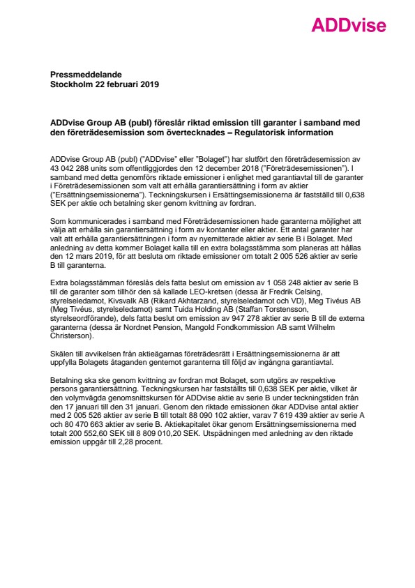 ADDvise Group AB (publ) (”ADDvise” eller ”Bolaget”) har slutfört den företrädesemission av 43 042 288 units som offentliggjordes den 12 december 2018 (”Företrädesemissionen”). I samband med detta genomförs riktade emissioner i enlighet med garantiavtal till de garanter i Företrädesemissionen som valt att erhålla garantiersättning i form av aktier (”Ersättningsemissionerna”). Teckningskursen i Ersättingsemissionerna är fastställd till 0,638 SEK per aktie och betalning sker genom kvittning av fordran.