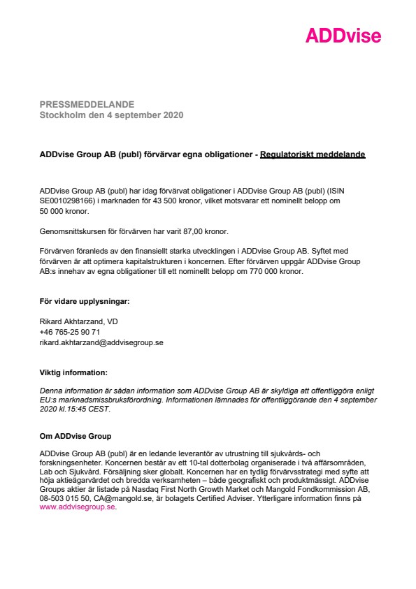 Denna information är sådan information som ADDvise Group AB är skyldiga att offentliggöra enligt EU:s marknadsmissbruksförordning. Informationen lämnades för offentliggörande den 4 september 2020 kl.15:45 CEST.