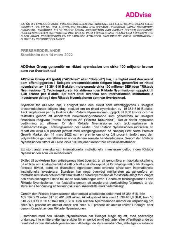 Styrelsen för ADDvise har, i enlighet med den avsikt som offentliggjordes i Bolagets pressmeddelande tidigare idag, beslutat om en riktad nyemission av 15 384 616 B-aktier. Teckningskursen per ny B-aktie i den Riktade Nyemissionen uppgick till 6,50 kronor och har fastställts genom ett accelererat bookbuilding-förfarande som genomförts av Bolagets finansiella rådgivare Pareto Securities AB (”Pareto Securities”). Det är därför styrelsens bedömning att villkoren för den Riktade Nyemissionen och teckningskursen är marknadsmässiga. Teckningskursen per B-aktie i den Riktade Nyemissionen motsvarar en rabatt om cirka 5,9 procent jämfört med stängningskursen på Nasdaq First North Premier Growth Market den 14 mars 2022 och en premie om cirka 0,9 procent jämfört med den volymviktade genomsnittskursen under de fem senaste handelsdagarna. Genom den Riktade Nyemissionen tillförs ADDvise cirka 100 miljoner kronor före emissionskostnader.