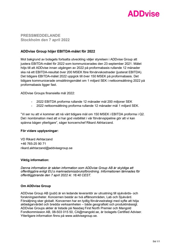 Mot bakgrund av bolagets fortsatta utveckling väljer styrelsen i ADDvise Group att justera EBITDA-målet för 2022 som kommunicerades den 23 september 2021. Målet höjs till att ADDvise innan utgången av 2022 på proformabasis rullande 12 månader ska nå ett EBITDA-resultat över 200 MSEK före förvärvskostnader (justerat EBITDA). Det tidigare EBITDA-målet 2022 uppgick till över 150 MSEK på proformabasis. Det tidigare kommunicerade omsättningsmålet om 1 miljard SEK i nettoomsättning 2022 på proformabasis ligger fast.