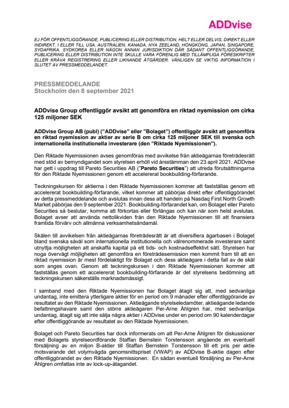 ADDvise Group AB (publ) (”ADDvise” eller ”Bolaget”) offentliggör avsikt att genomföra en riktad nyemission av aktier av serie B om cirka 125 miljoner SEK till svenska och internationella institutionella investerare (den ”Riktade Nyemissionen”).