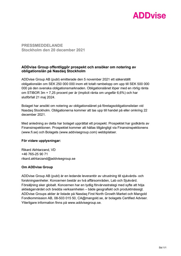 Med anledning av detta har bolaget upprättat ett prospekt. Prospektet har godkänts av Finansinspektionen. Prospektet kommer att hållas tillgängligt via Finansinspektionens (www.fi.se) och Bolagets (www.addvisegroup.com) webbplatser.