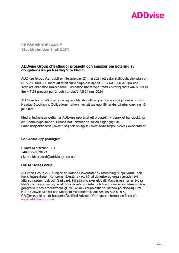 Med anledning av detta har ADDvise upprättat ett prospekt. Prospektet har godkänts av Finansinspektionen. Prospektet kommer att hållas tillgängligt via Finansinspektionens (www.fi.se) och bolagets (www.addvisegroup.com) webbplatser.