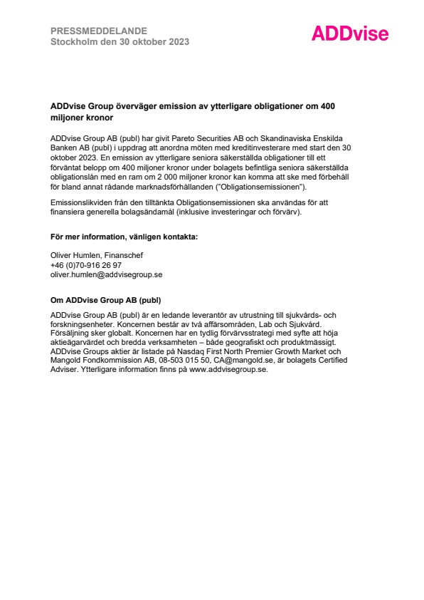 ADDvise Group AB (publ) har givit Pareto Securities AB och Skandinaviska Enskilda Banken AB (publ) i uppdrag att anordna möten med kreditinvesterare med start den 30 oktober 2023. En emission av ytterligare seniora säkerställda obligationer till ett förväntat belopp om 400 miljoner kronor under bolagets befintliga seniora säkerställda obligationslån med en ram om 2 000 miljoner kronor kan komma att ske med förbehåll för bland annat rådande marknadsförhållanden (”Obligationsemissionen”).