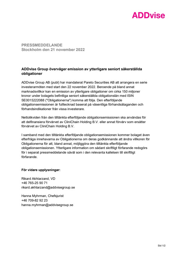 ADDvise Group AB (publ) har mandaterat Pareto Securities AB att arrangera en serie investerarmöten med start den 22 november 2022. Beroende på bland annat marknadsvillkor kan en emission av ytterligare obligationer om cirka 150 miljoner kronor under bolagets befintliga seniort säkerställda obligationslån med ISIN SE0015222088 (”Obligationerna”) komma att följa. Den efterföljande obligationsemissionen är fulltecknad baserat på väsentliga förhandsåtaganden och förhandsindikationer från vissa investerare.