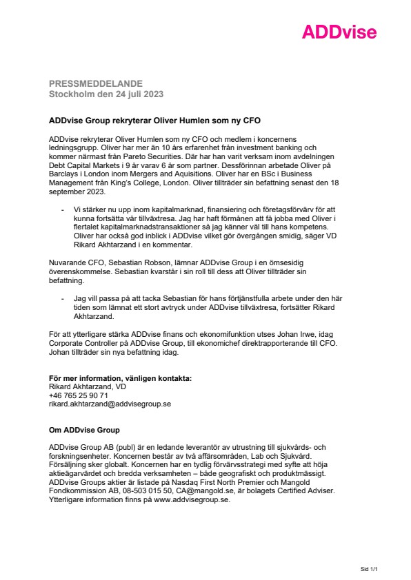 Nuvarande CFO, Sebastian Robson, lämnar ADDvise Group i en ömsesidig överenskommelse. Sebastian kvarstår i sin roll till dess att Oliver tillträder sin befattning.