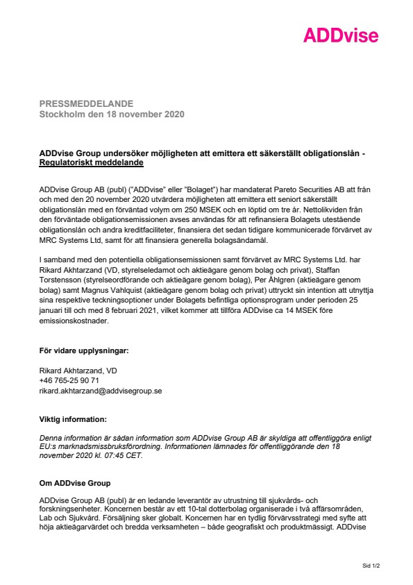 ADDvise Group AB (publ) (”ADDvise” eller ”Bolaget”) har mandaterat Pareto Securities AB att från och med den 20 november 2020 utvärdera möjligheten att emittera ett seniort säkerställt obligationslån med en förväntad volym om 250 MSEK och en löptid om tre år. Nettolikviden från den förväntade obligationsemissionen avses användas för att refinansiera Bolagets utestående obligationslån och andra kreditfaciliteter, finansiera det sedan tidigare kommunicerade förvärvet av MRC Systems Ltd, samt för att finansiera generella bolagsändamål.