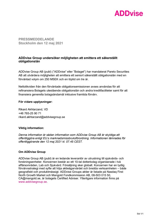 ADDvise Group AB (publ) (”ADDvise” eller ”Bolaget”) har mandaterat Pareto Securities AB att utvärdera möjligheten att emittera ett seniort säkerställt obligationslån med en förväntad volym om 250 MSEK och en löptid om tre år.