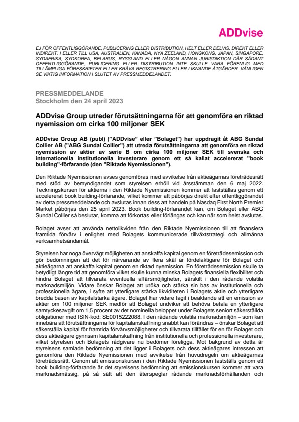 ADDvise Group AB (publ) (”ADDvise” eller ”Bolaget”) har uppdragit åt ABG Sundal Collier AB (”ABG Sundal Collier”) att utreda förutsättningarna att genomföra en riktad nyemission av aktier av serie B om cirka 100 miljoner SEK till svenska och internationella institutionella investerare genom ett så kallat accelererat ”book building”-förfarande (den ”Riktade Nyemissionen”).