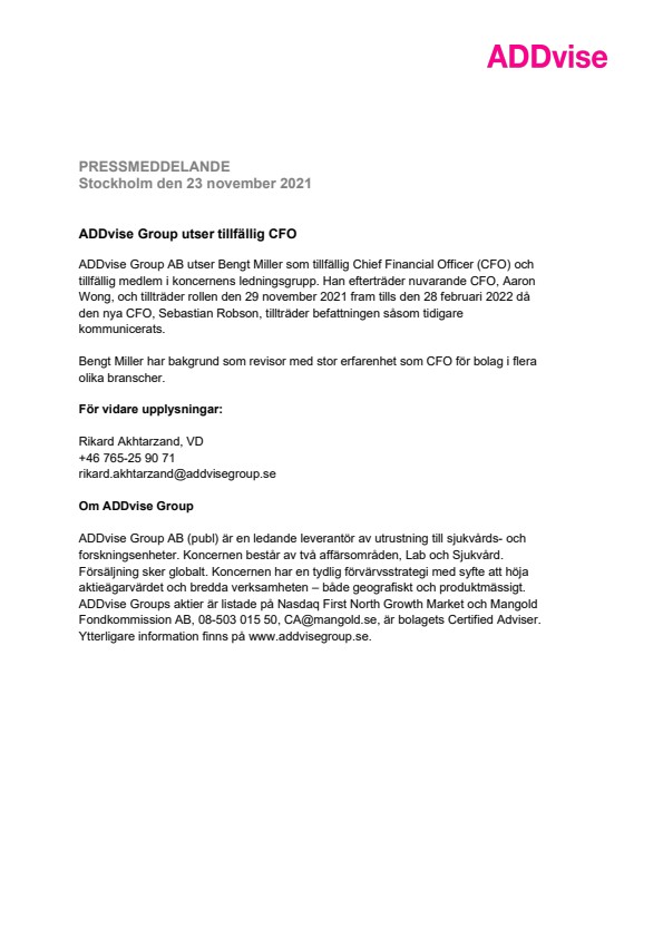 ADDvise Group AB utser Bengt Miller som tillfällig Chief Financial Officer (CFO) och tillfällig medlem i koncernens ledningsgrupp. Han efterträder nuvarande CFO, Aaron Wong, och tillträder rollen den 29 november 2021 fram tills den 28 februari 2022 då den nya CFO, Sebastian Robson, tillträder befattningen såsom tidigare kommunicerats.