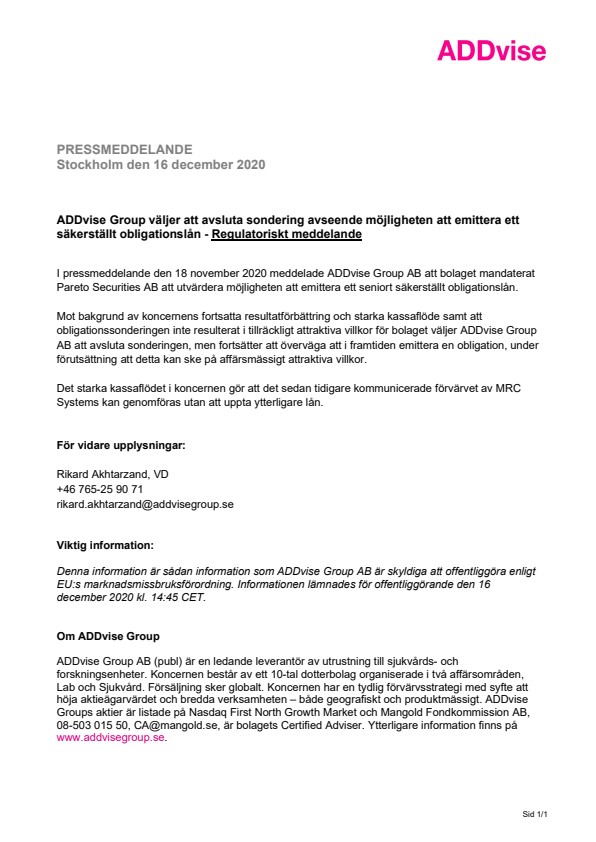 Mot bakgrund av koncernens fortsatta resultatförbättring och starka kassaflöde samt att obligationssonderingen inte resulterat i tillräckligt attraktiva villkor för bolaget väljer ADDvise Group AB att avsluta sonderingen, men fortsätter att överväga att i framtiden emittera en obligation, under förutsättning att detta kan ske på affärsmässigt attraktiva villkor.