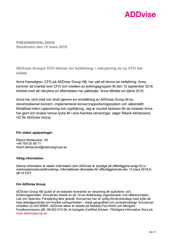 Anna Hasselgren, CFO på ADDvise Group AB, har valt att lämna sin befattning. Anna kommer att kvarstå som CFO och medlem av ledningsgruppen till den 12 september 2018. Arbetet med att rekrytera en efterträdare har påbörjats. Anna tillträde sin tjänst 2016.