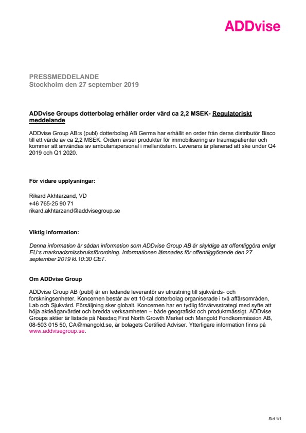 ADDvise Group AB:s (publ) dotterbolag AB Germa har erhållit en order från deras distributör Bisco till ett värde av ca 2,2 MSEK. Ordern avser produkter för immobilisering av traumapatienter och kommer att användas av ambulanspersonal i mellanöstern. Leverans är planerad att ske under Q4 2019 och Q1 2020.