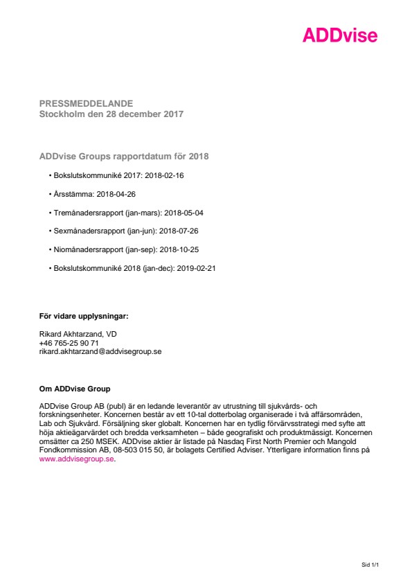 Om ADDvise Group ADDvise Group AB (publ) är en ledande leverantör av utrustning till sjukvårds- och forskningsenheter. Koncernen består av ett 10-tal dotterbolag organiserade i två affärsområden, Lab och Sjukvård. Försäljning sker globalt. Koncernen har en tydlig förvärvsstrategi med syfte att höja aktieägarvärdet och bredda verksamheten – både geografiskt och produktmässigt. Koncernen omsätter ca 250 MSEK. ADDvise aktier är listade på Nasdaq First North Premier och Mangold Fondkommission AB, 08-503 015 50, är bolagets Certified Adviser. Ytterligare information finns på www.addvisegroup.se.